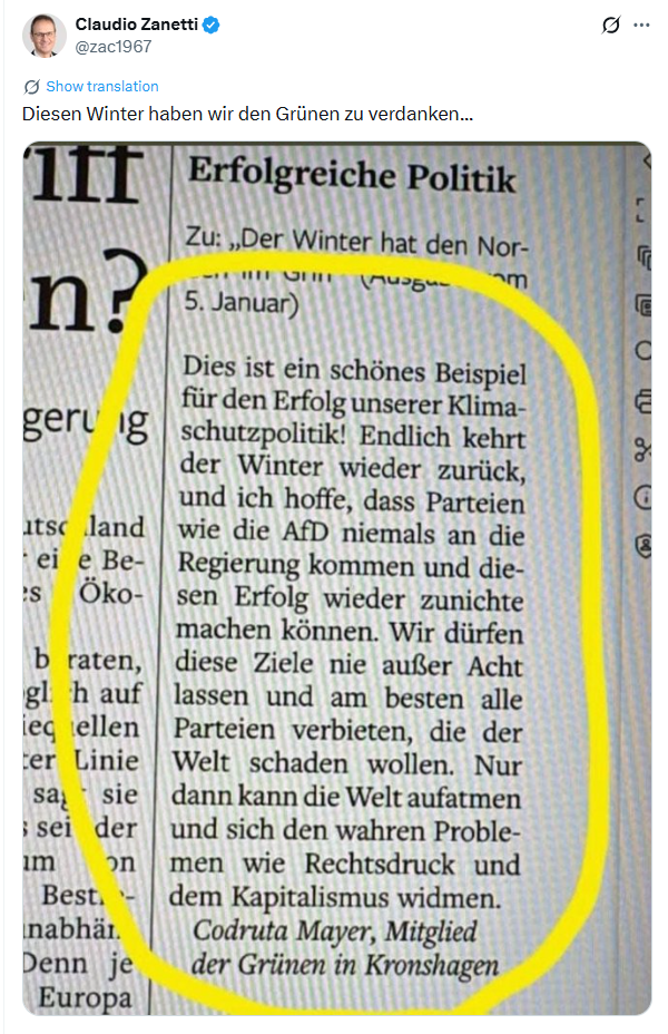 Matthias Müller / 11.02.2025 Darüber sind sich tatsächlich alle Klimawissenschaftler und Historiker einig: Wir kommen aus der “Kleinen Eiszeit”, die etwa von 1450 bis 1880 ging und schlimme Hungersnöte und Elend mit sich brachte. An deren Ende hatten z.B. die Alpen-Gletscher ihre größte Ausdehnung seit tausenden von Jahren. Kein Wunder also, dass sie vom Ende des 19. Jahrhunderts bis jetzt wieder kleiner wurden. Dass in dieser Zeit eine Industrialisierung stattfand, ist auch unbestritten. Aus beiden aber einen Zusammenhang zu konstruieren, ist reinste Spekulation in Form einer irren Attribution. Das ist so, als würde man den ab März rapide ansteigenden Verkauf von Lindt-Schokohasen als Ursache ansehen, dass die Bäume ausschlagen und die Obstbäume zu blühen anfangen. – Es hat in den zurückliegenden Jahrtausenden immer wieder Kälte- und Wärmeperioden gegeben, ohne dass es eine Industrialisierung gab. Sie werden unbestritten auf Veränderungen der Planetenbahnen und der Sonnenaktivität zurückgeführt. Im Mittelalter besiedelten z.B. die Wikinger “Grünland” (Grönland) und wurde Wein in Norwegen angebaut. Auch zur Römerzeit war es wesentlich wärmer als jetzt, sodass mit mehreren Ernten pro Jahr die Bevölkerung des Weltreichs ernährt werden konnte. Es fiel in sich zusammen, als ab 350 n. Chr. ein plötzlicher Klimawandel zum Kalten eintrat und germanische Stämme wie die Vandalen deshalb zur “Völkerwanderung” nach Süden gezwungen waren, die schließlich im Jahr 455 Rom plünderten. Warum in alles in der Welt, hatten also frühere Klimawandel natürliche Ursachen und soll das jetzige Rauskommen aus der “Kleinen Eiszeit” unnatürlich sein? Während der “Kleinen Eiszeit” verbreitete die Obrigkeit, dass der Klimawandel von Menschen verursacht worden sei und verfolgte die “Hexen”. – Heute sind es keine Hexen mehr, die drangsaliert werden, sondern alle energieverbrauchenden “Konsumenten”, die sich aber per Ablass (CO2-Steuer) von ihrer Schuld freikaufen können. zu einem interessanten Artikel auf Achgut.com: |