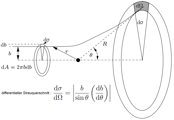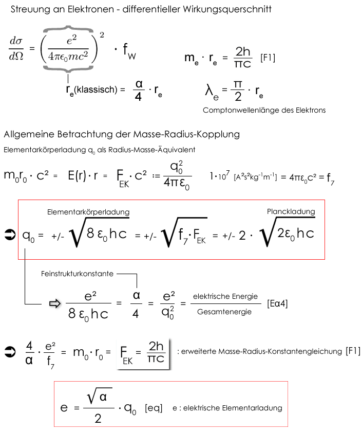 Der differentielle Streuquerschnitt dσ/dΩ nimmt für Elektronen stets die Gestalt dσ/dΩ = (e²/me4πε0c²)² · fW an, wobei der funktionale Zusammenhang fW die spezifische Art der Streuung angibt. Details zu fW finden sich exemplarisch zu den jeweiligen "Streugleichungen", von denen im Anschluss einige explizit aufgeführt sind. Das Verständigungs-Problem der herrschenden Physik bezüglich des (ungeliebten) klassischen Elektronenradius re(kl) löst sich auf, wenn man den wiederkehrenden Term (e²/me4πε0c²) masse-radius-gekoppelt-energetisch analysiert. Letztendlich besteht die Beziehung (e²/me4πε0c²) aus dem Verhältnis: elektrischer Energie zu Gesamtenergie (α/4) und dem Elektronenmasse inhärenten Elektronenradius re, der multipliziert mit π/2 der Comptonwellenlänge des Elektrons entspricht (λe = re · π/2).