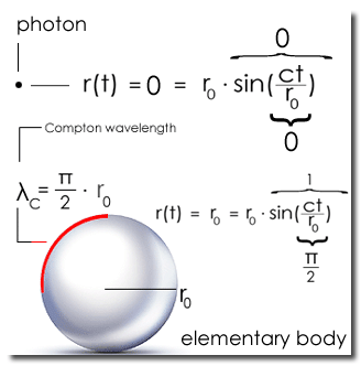 In diesem Sinne gibt es auch im Denkmodell der Elementarkörper den masse- und raumlosen Zustand (als Energieäquivalent). Das bedeutet: Das (kodierte) Information eine Energieform ist. Interessanterweise hat dies keinen Einfluss auf die Wechselwirkungen der Elementarkörper respektive der daraus konstruierten Materie im Hinblick auf den Wechselwirkungs-Formalismus. Wie später erläutert wird, muss zwischen der inneren Dynamik des Elementarkörpers (EK) und der Informations- respektive Energie-Translation mit Lichtgeschwindigkeit in "Gestalt" von Photonen phänomenologisch unterschieden werden.