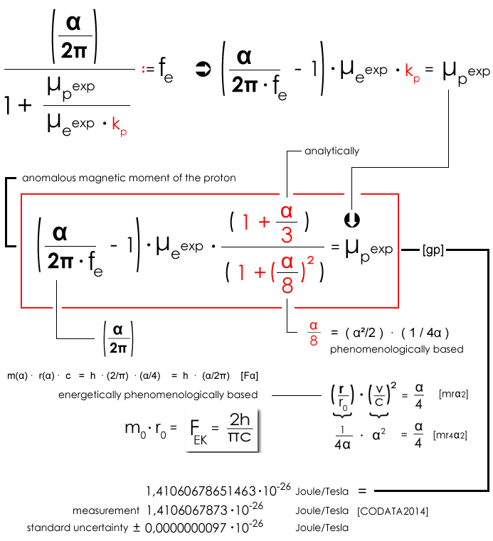 In the chapter spin and magnetic moments as well as in the chapters hydrogen atom and fine structure constant α it is shown that the factor α/8 is derived from the energetic relations in the hydrogen atom, i.e. an interaction of proton and electron, phenomenologically justified and is directly connected with the ground state energy of the hydrogen atom, the fine-structure constant, the Bohr radius and the associated electric elementary charge. Furthermore, the mass ratio mp/me plays a central role. It should be noted at this point that the phenomenological foundations lead, among other things, to exact calculations of ground state energies and to the derivation of Sommerfeld's fine-structure constant. If one embodies the magnetic field in an "energetic analogy", the metrologically recorded magnetic moment of the proton and the electron result from the energetic superposition with the magnetic field. The magnetic field itself as "energy generator" interacts with electron and proton and provides a measurement-inherent, coupled contribution of the order of 1e-26 J/T to the measured magnetic moment of the object to be "examined". This means that the entire mathematical QFT-magic around supposedly anomalous (intrinsic) magnetic moments and their "leptonic" QED corrections are theory-induced, or simply formulated - in the truest sense of the word - are irrelevant. Furthermore, it follows that the experimentally determined magnetic moment of the proton is now plausible without a substructure. Since the neutron has no electric charge, the magnetic moment of the neutron reduces to the magnetic field contribution induced by the neutron. In this model, the neutron is electron-proton based. This phenomenologically based assumption finds an indirect confirmation by the (exact) calculation possibility of the neutron mass within the framework of this model. |
